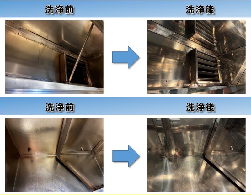 飲食店(居酒屋)店舗のエアコンクリーニング(ファンケーシング)の清掃前後の比較 東京都23区千代田区 エアコンクリーニング業務用エアコン天井吊り型 飲食店居酒屋 ヤニ油汚れホコリ アルミフィンクリーナー