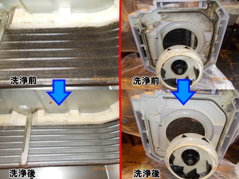飲食店(居酒屋)のエアコンクリーニング洗浄前後の比較 東京都23区荒川区 ドレンパン天井カセット型エアコンクリーニング業務用エアコン 居酒屋 油汚れカビホコリ アルミフィンクリーナーエアコン専用洗剤高圧洗浄