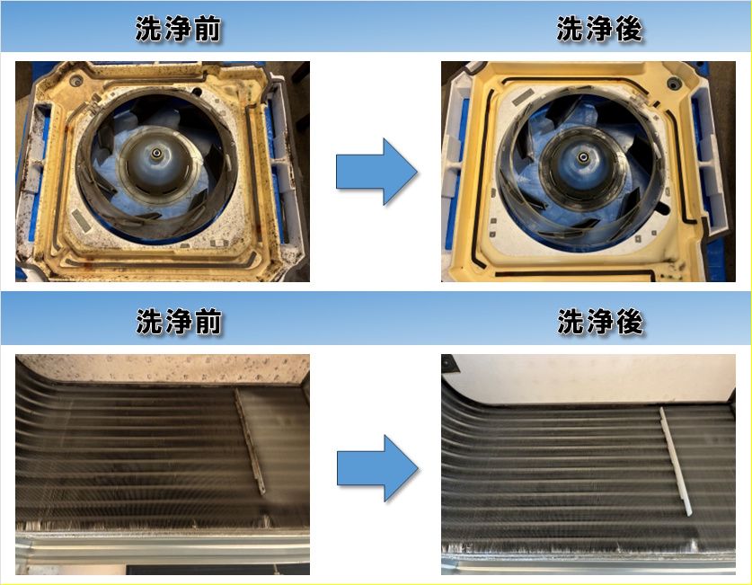 | 効果・結果 | 綺麗な状態となりました。その他、ドレンポンプやドレン配管の中も清掃しております。 |