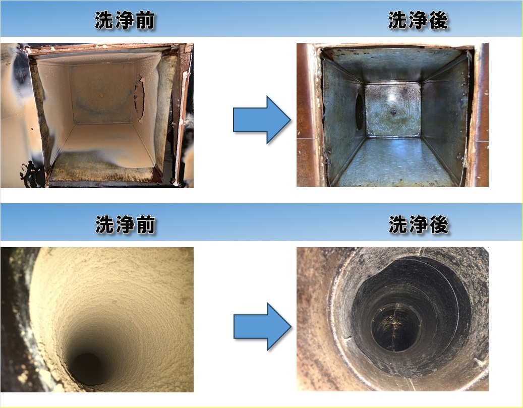 【施工事例】飲食店のダクト清掃前後の比較 2026年2月 汚れの状態内部に油汚れ、埃による汚れが付着していました。 方法・手法ハツリ工法、高圧洗浄を行いました。 効果・結果綺麗な状態となりました。 所在地 東京都23区世田谷区 清掃種類 排気ダクトダクトクリーニング厨房清掃飲食店 清掃場所 レストラン飲食店 汚れの種類 油汚れホコリ 洗剤・機材 はつり工法(スクレイピング)高圧洗浄 ダクト清掃は最安値に挑戦する東京・埼玉の清掃会社ACE(エース)にお任せください!