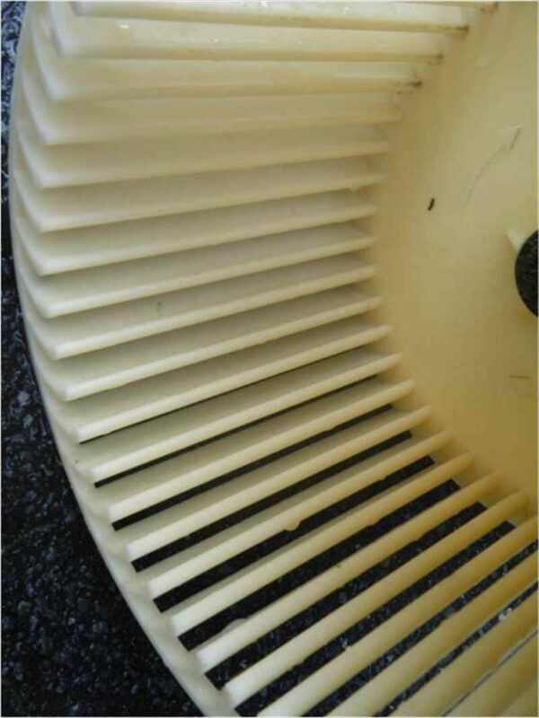 油を使った調理が多い中華料理店の厨房エアコンなので、シロッコファンにも油汚れが多く付着していました。